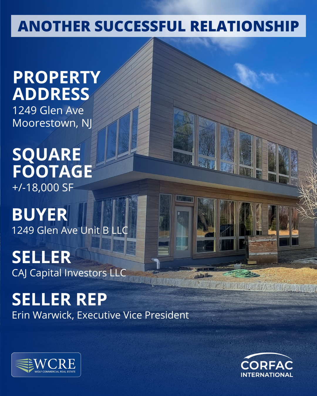 WCRE is pleased to announce the successful sale of a newly constructed industrial building located at 1249 Glen Ave in Moorestown, New Jersey. The +/-18,000 square-foot industrial property was sold by CAJ Capital Investors LLC to 1249 Glen Ave Unit B LLC.