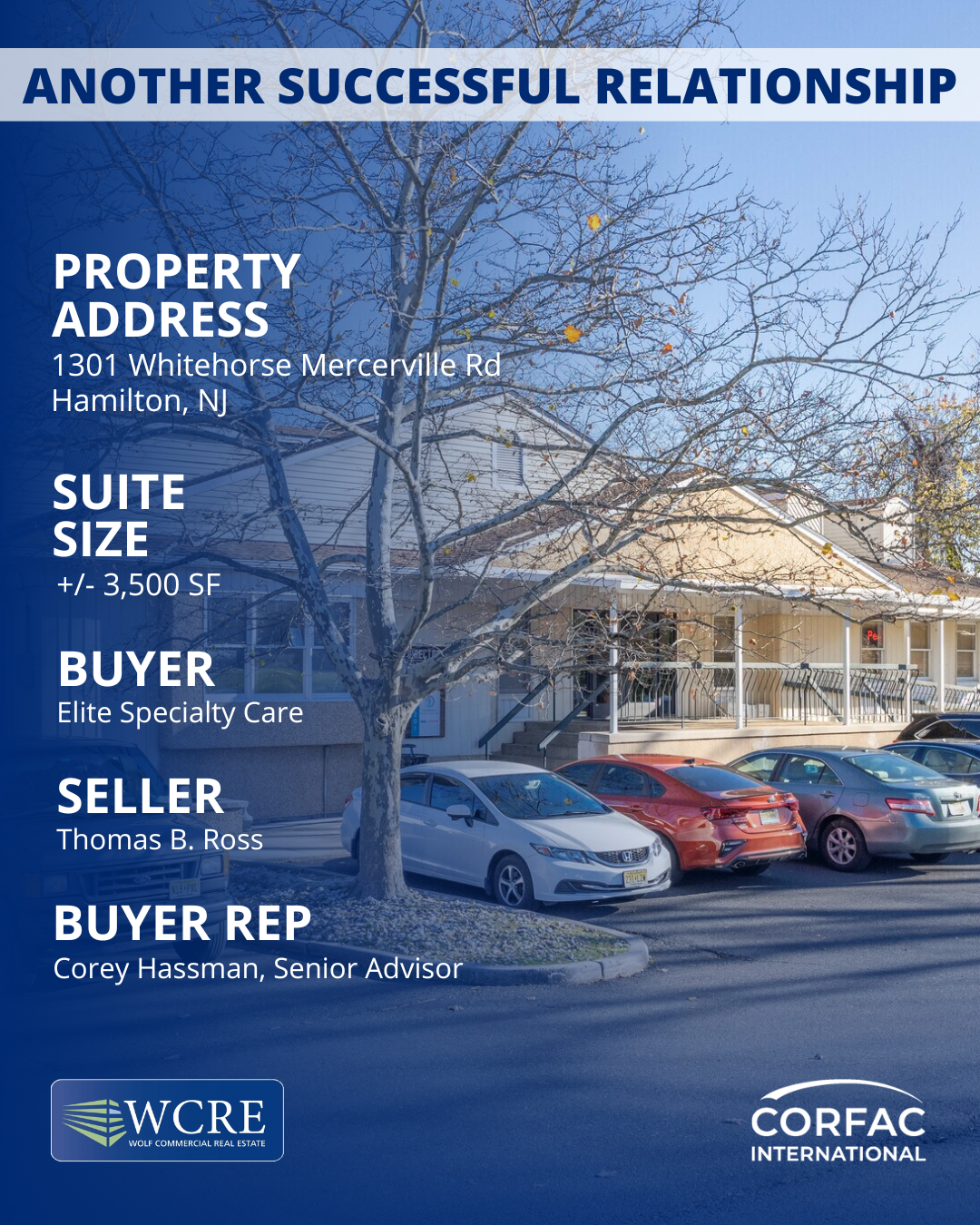 WCRE is pleased to announce the successful sale of a ±3,500 square foot medical office building located at 1301 Whitehorse Mercerville Road in Hamilton, New Jersey.