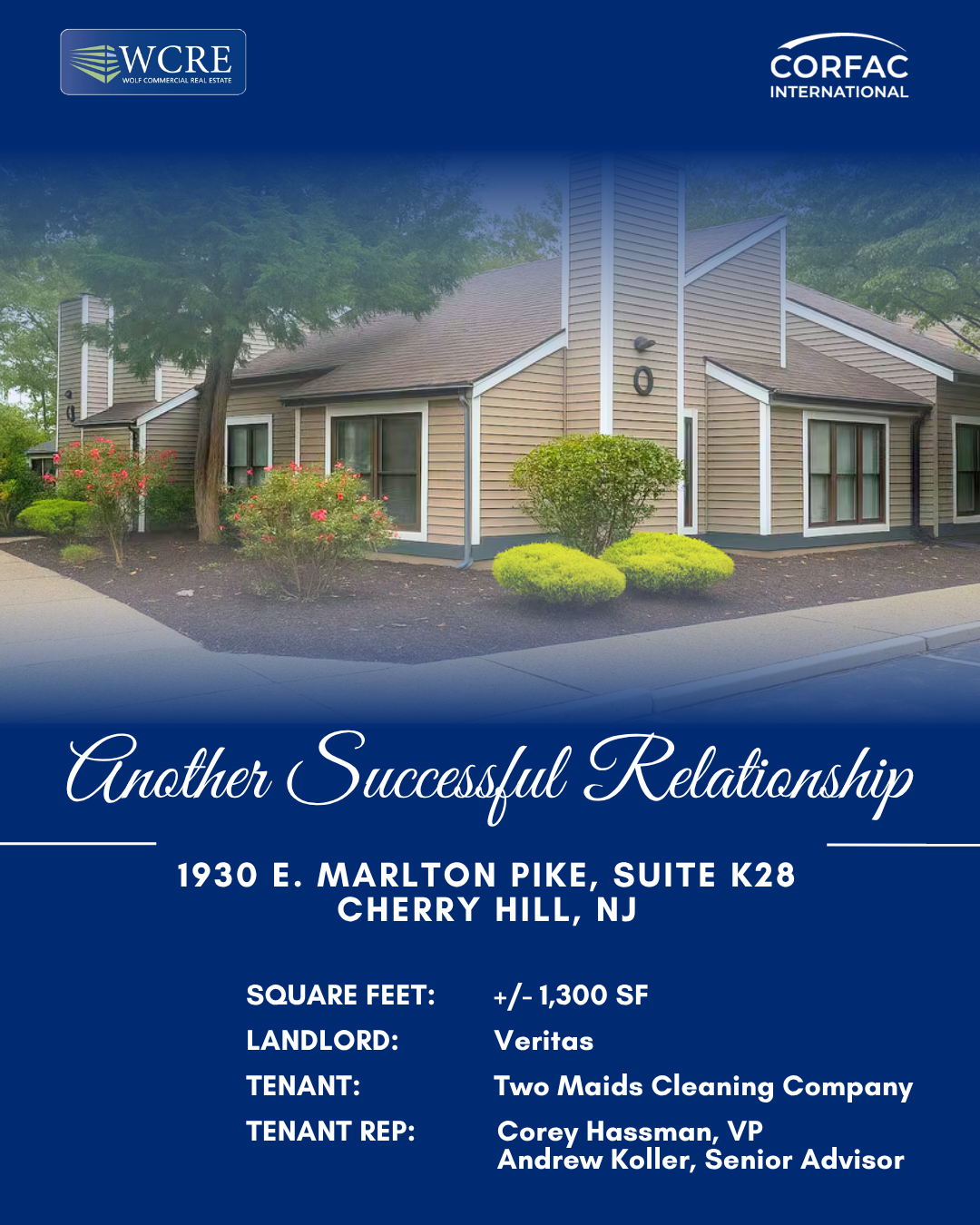 The professional office space will be occupied by the Tenant, Two Maids Cleaning Company, as they expand their presence into the South Jersey market with a new independently operated location.