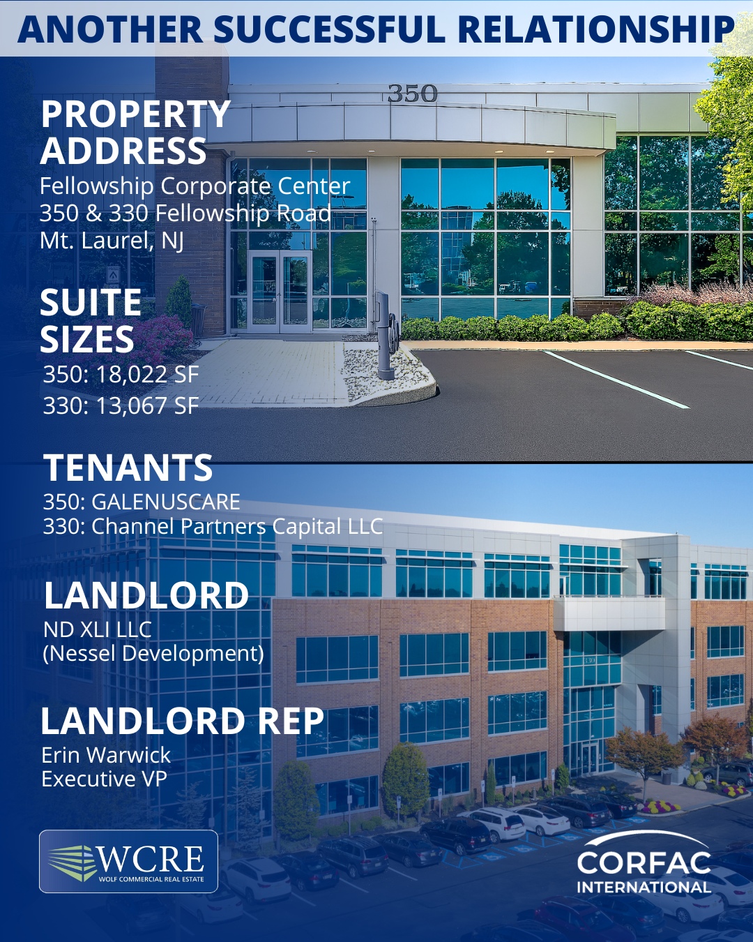 Erin Warwick, Executive Vice President at WCRE, represented the landlord, ND XLI LLC (Nessel Development), in both transactions. For inquiries regarding the available space at 330 Fellowship Road, please contact Erin at erin.warwick@wolfcre.com or visit https://wolfcre.com/listing/fellowship-corp-ctr-mt-laurel-new-jersey/ for property details.