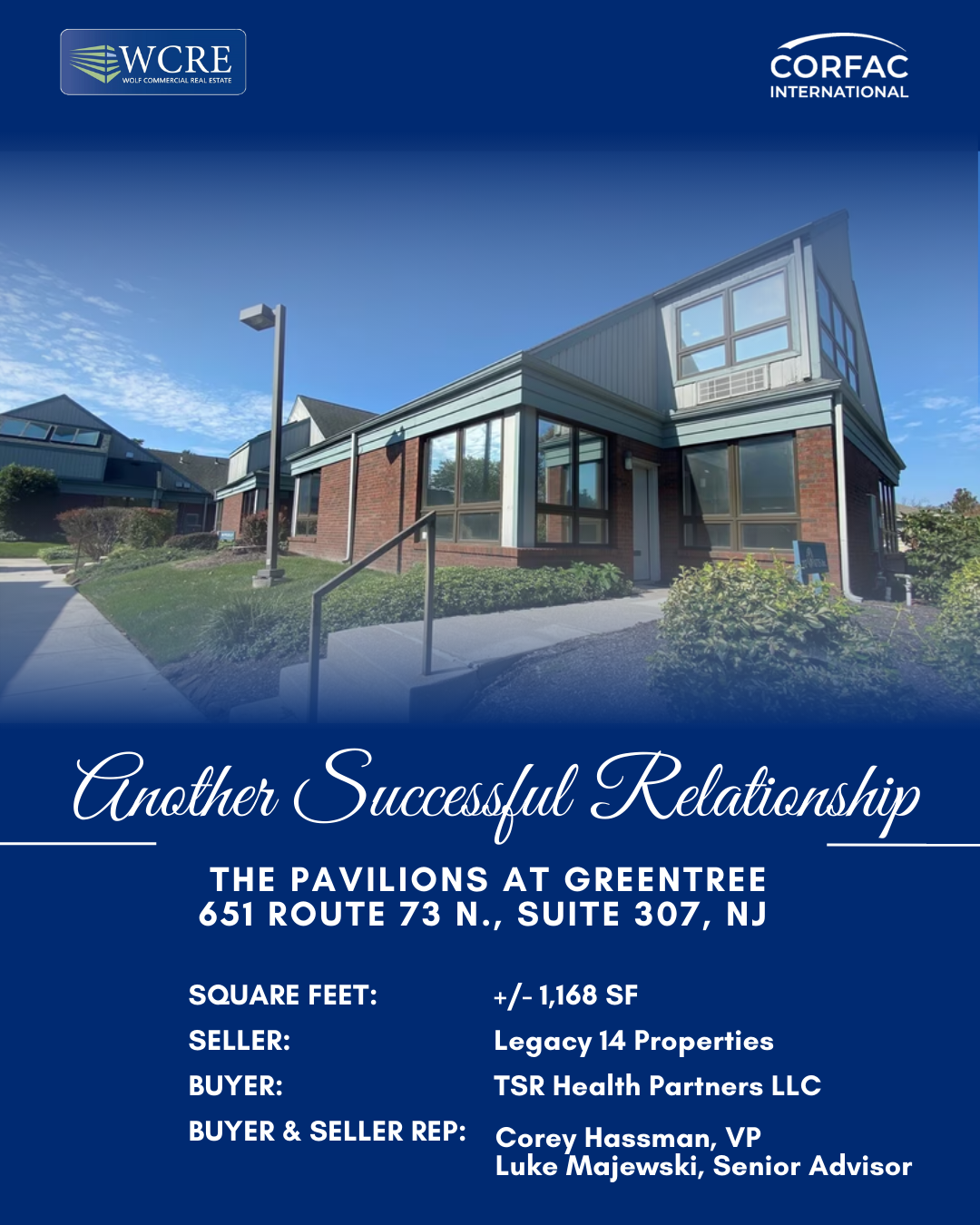 WCRE is pleased to announce the successful sale of 651 Route 73 North, Suite 307, Marlton, New Jersey, also known as The Pavilions at Greentree, a 1,168-square-foot office condominium.