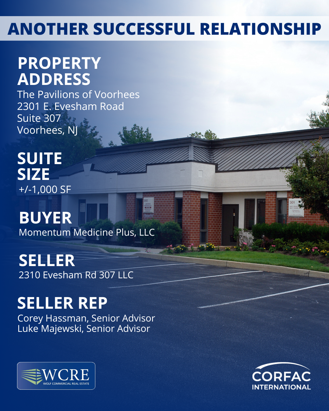 WCRE is pleased to announce the successful sale of a +/-1,000 SF medical office condo at The Pavilions of Voorhees, 2301 East Evesham Road, Suite 307, Voorhees, New Jersey, where WCRE exclusively represented the Seller, 2310 Evesham Road 307 LLC.